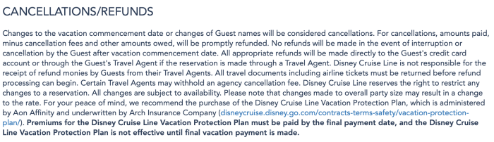 Cancellation fees can apply in certain situations. If you have already paid for your cruise in full, booked it with a Future Cruise Credit, or booked it under a restricted rate or concierge category, it’s recommended that you call the Disney Cruise Line Contact Center at (800) 951-3532 for assistance.
