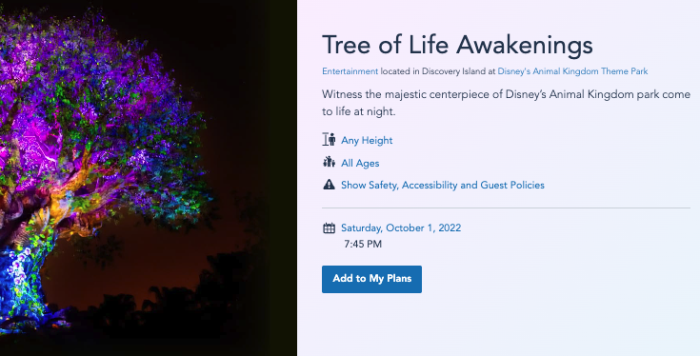 The first show we can see shows up at 7:45PM on October 1st. Before that date, no showtimes show up on the My Disney Experience app.