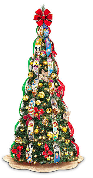 This tree is decorated with over 65 Disney characters, who can be found on satiny ribbons. There are 6 specialty ornaments included, as well as 46 non-breakable metallic ornaments. The tree is lit with 200 miniature lights. You can get this tree for $199.99.