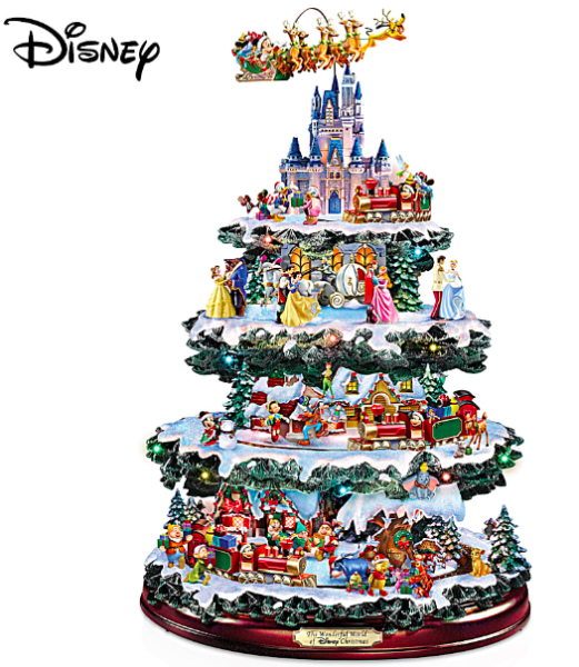 First, there’s the Ultimate Disney Tabletop Christmas Tree. This 4-tier tree features 75 hand-painted Disney character figures, 10 different holiday scenes, and 20 LED lights. It also plays Christmas tunes.