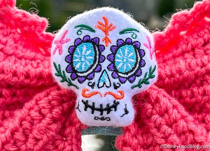 …and a pink crocheted bow. There’s a decorated candy skull in the middle.