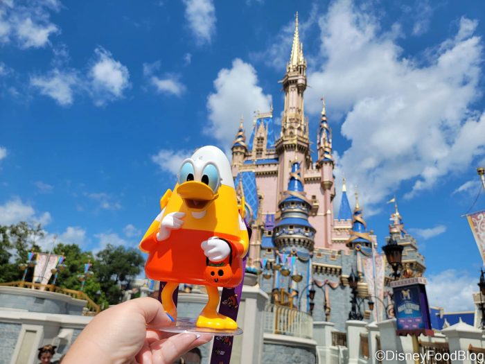 Introducing the Donald Candy Corn Sipper. It’s a souvenir cup that is available at multiple locations throughout the park during both regular park hours and Mickey’s Not-So-Scary Halloween Party. We got one from Sleepy Hollow Refreshments for $13.