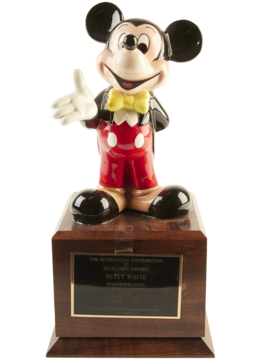 Another unique item is the Disney-MGM Studios Mickey “Outstanding Contribution to Television Trophy.” This trophy was presented to Betty White in 1989 and features Mickey atop a wooden base. It was estimated at $500-$700 and sold for $7,680.