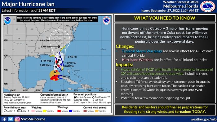 As of September 27th, Hurricane Ian was a Category 3 hurricane emerging off the northern coast of Cuba, and heading toward Florida. Tropical Storm Warnings are in effect for all of east central Florida (including the Disney World counties), and Hurricane Watches are in effect for some mainland counties (including the Disney World counties).
