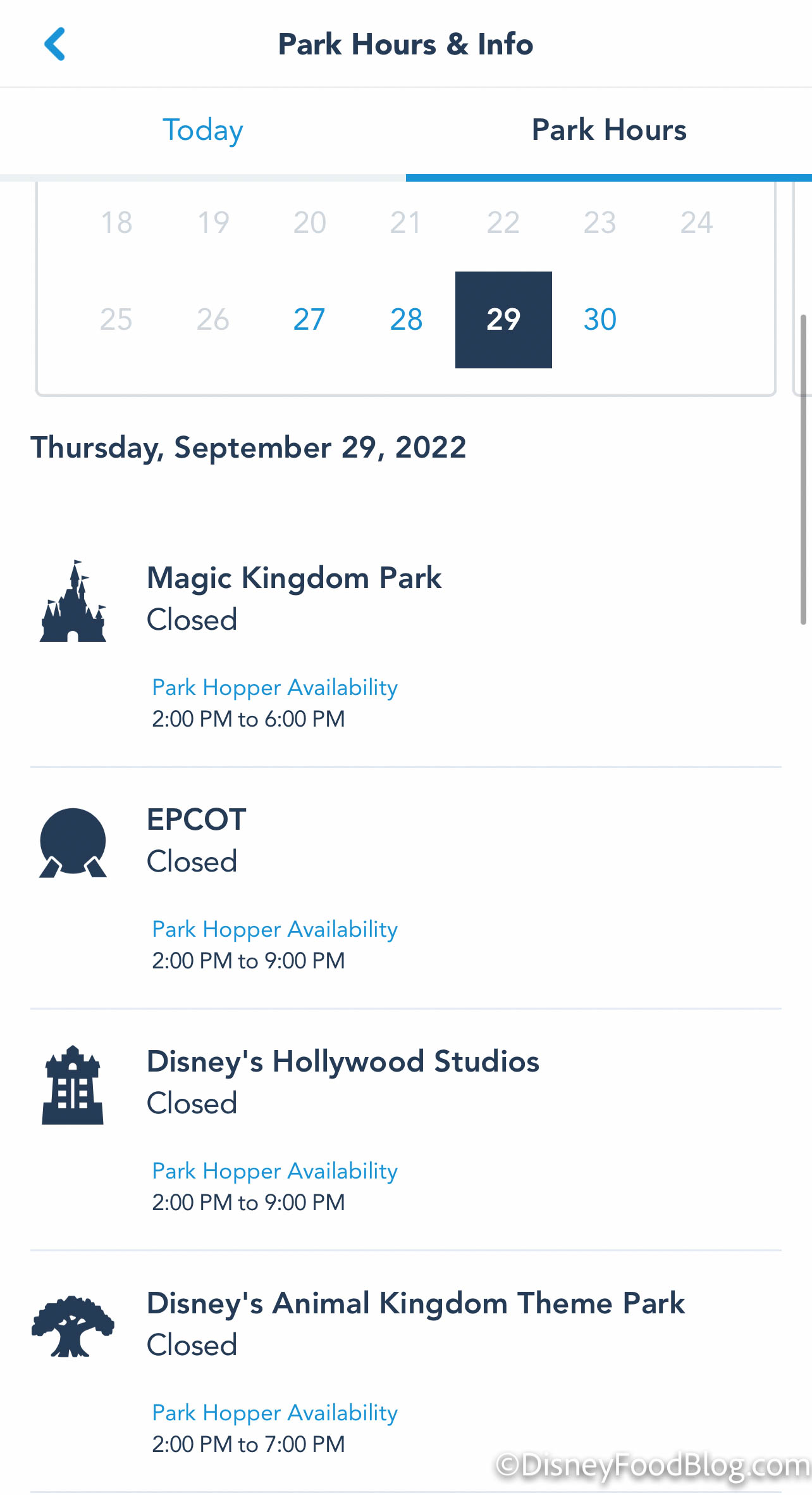 If you go to the My Disney Experience app, you’ll now see that no hours are shown for the theme parks and they are marked as “closed” on September 28th…