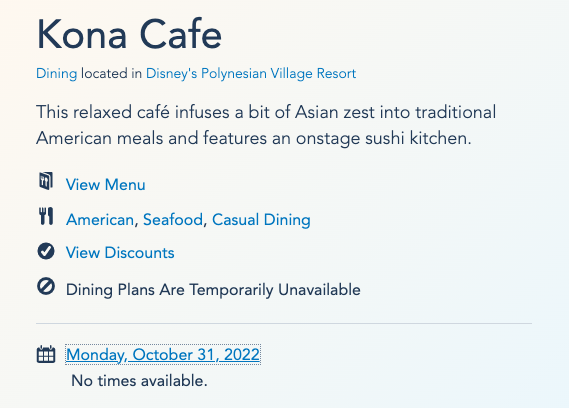 We were poking around the Disney World website and checked the calendar for Kona Café — and it looks like there are still no times available through October 31st, 2022.