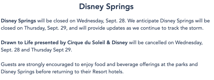 Also note that Disney Springs is closed today, Wednesday, September 28th, and is anticipated to be closed on Thursday, September 29th.