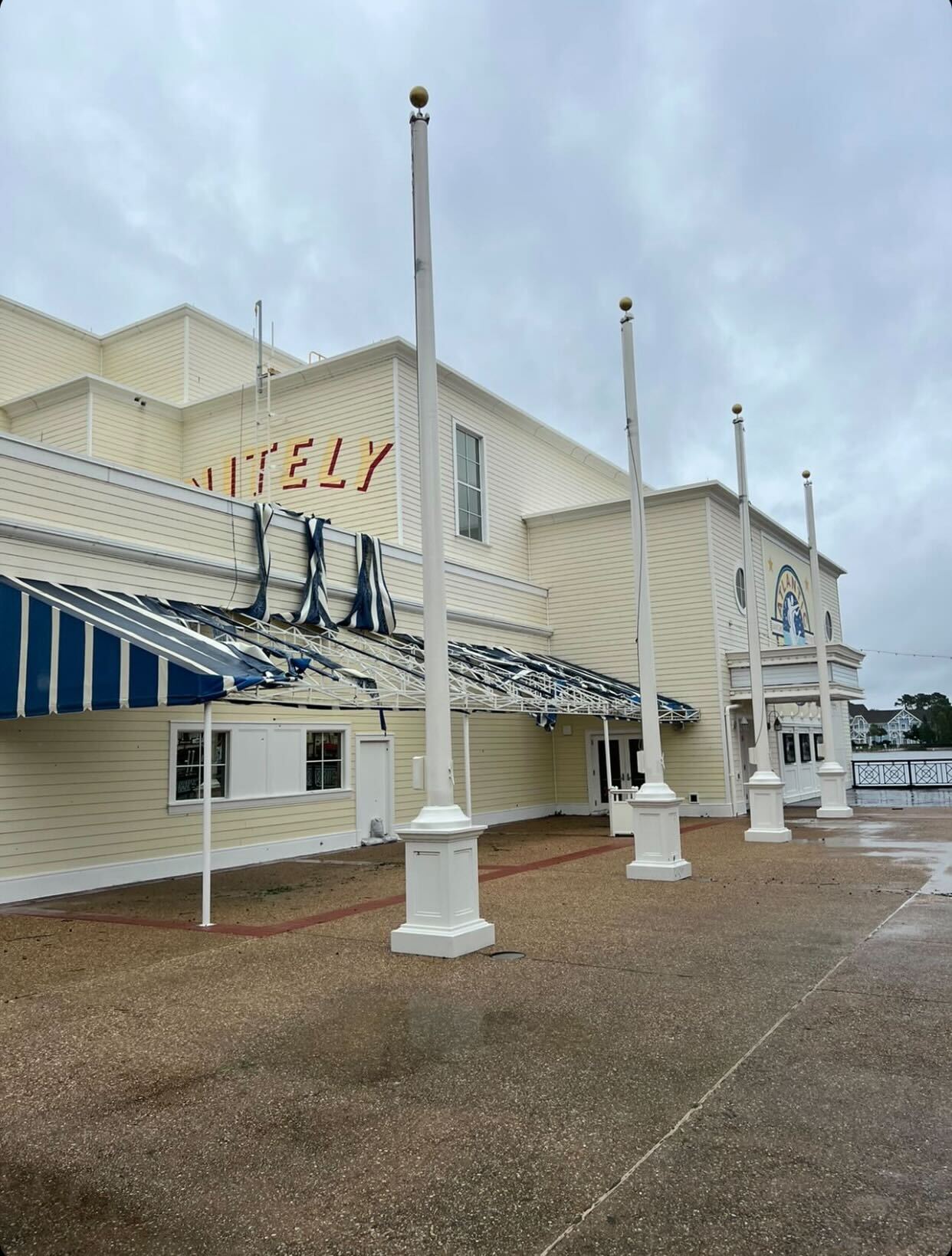 The parks remain closed, and we have seen some damage around Disney World. Our reader (@dakotadickey.mp4) shared this photo with us of the damaged awning at the Atlantic Dance Hall at Disney’s BoardWalk.