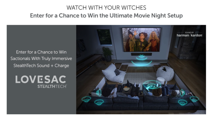 Lovesac, the company that creates Sactionals with speakers and subwoofer built inside to create a 4D sound environment, has partnered with Disney+ to grant one winner the Ultimate Movie Night Setup with their Sactionals in their Watch With Your Witches sweepstake!