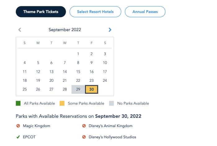 As usual, Park Pass Reservations are required to enter any theme park on Friday, September 30th. The Park Pass Reservation calendar has been updated to show available parks on Friday. Previously, it was showing that there were no passes available. Now, it looks like there are only available passes for EPCOT.