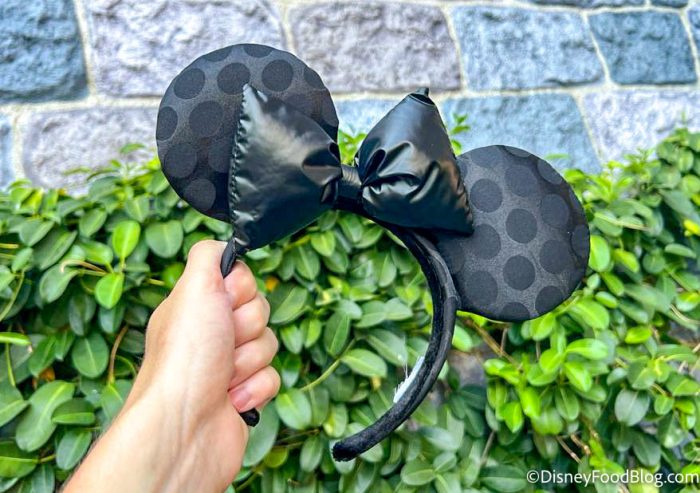 The ears are covered in a monochromatic black polka dot pattern paired with an off-center shiny faux leather bow. Are you someone who only wears black? These are THE Minnie Ears for you.