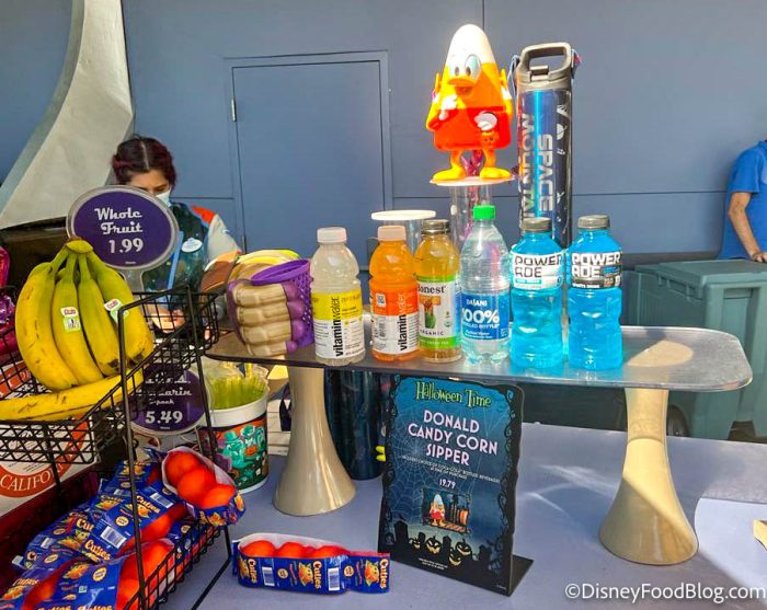 We found the Donald Candy Corn Sipper at the Tomorrowland Fruit Cart for $19.79, and it’s basically exactly what it sounds like! Donald is dressed in a candy corn costume and holding a small trick-or-treat bucket, and he also comes with a purple lanyard so you can easily carry him around Disneyland.