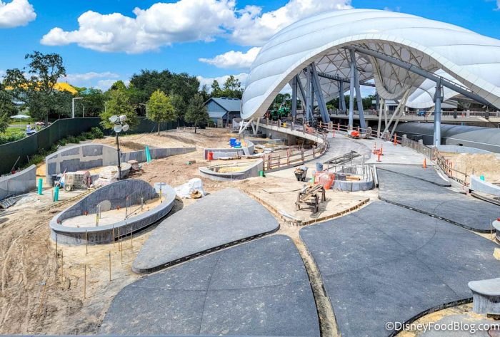 Never did we think we’d get so excited about cement, but here we are. Some fancy free-form shapes have appeared down in front of the TRON canopy. We caught a glimpse of crews working on them recently!
