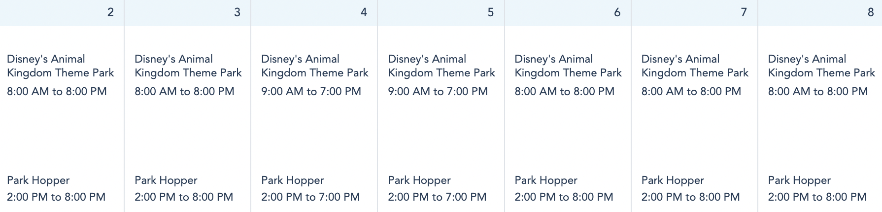 In Disney’s Animal Kingdom, the park will be open from 8AM to 8PM on October 2nd, 3rd, 6th, 7th, and 8th. .