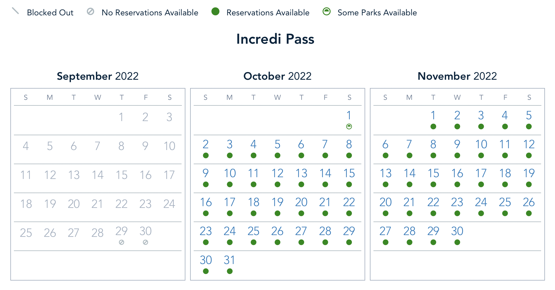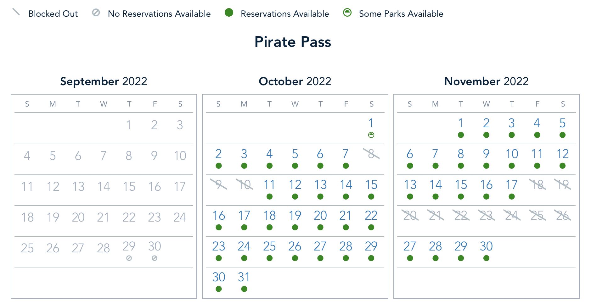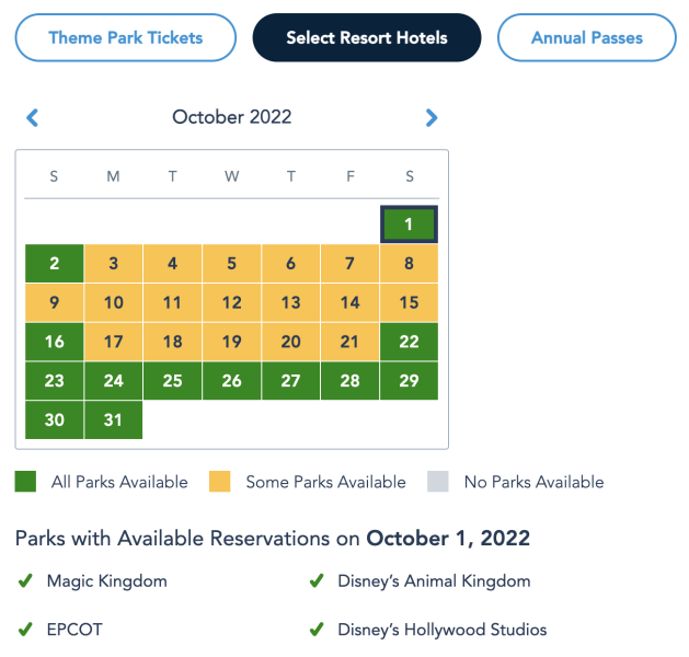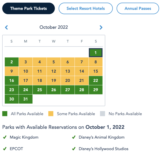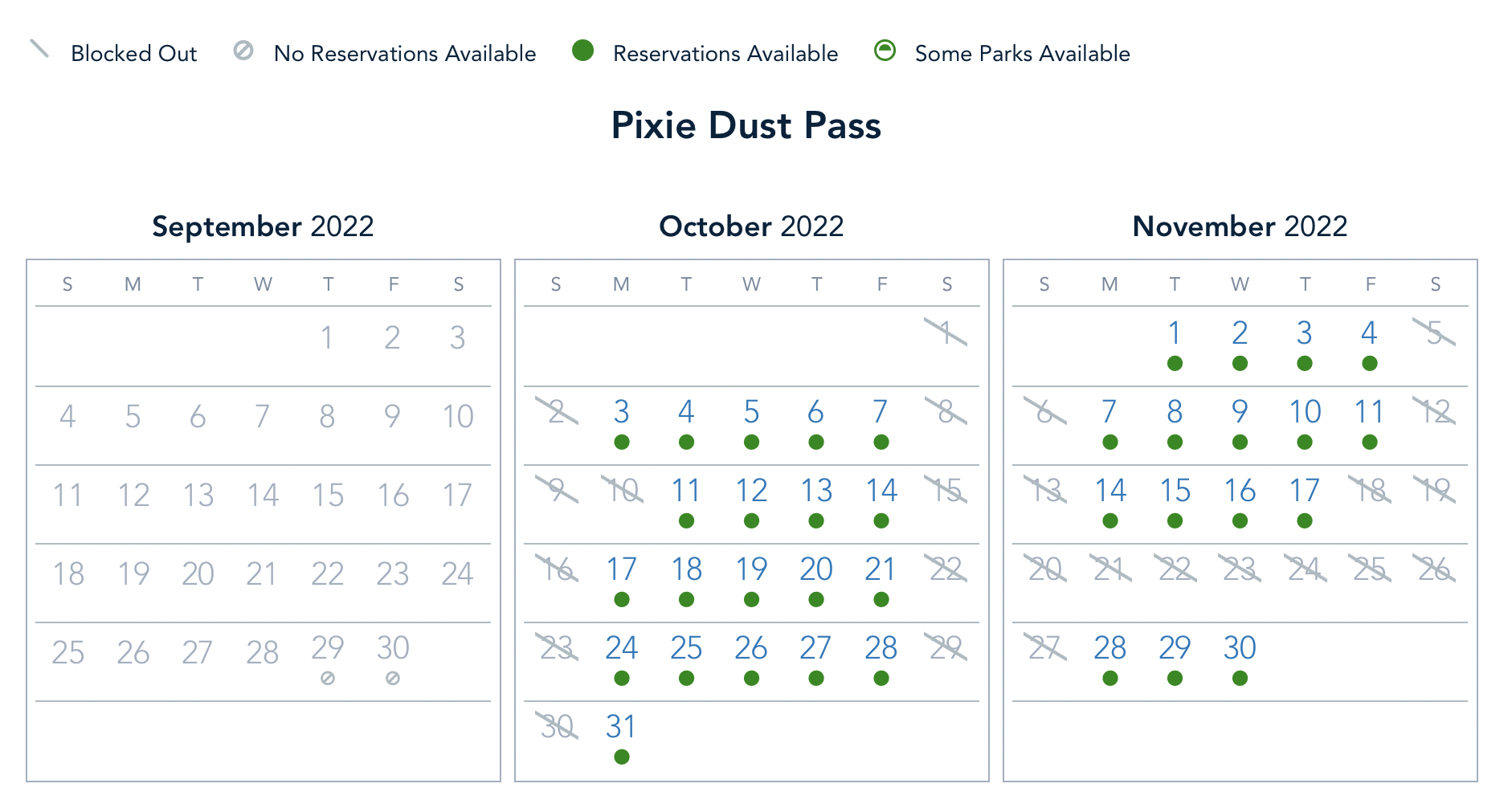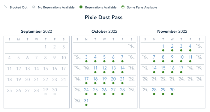And the Pixie Dust Pass is blocked on October 2nd and the 8th, with weekdays open for reservations.