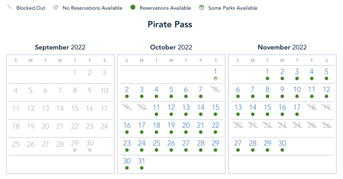The Pirate Pass is blocked out on October 8th, but otherwise has full park availability from October 2nd to the 7th.