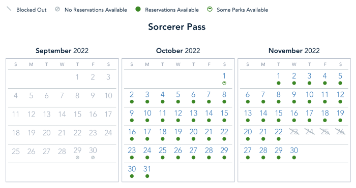When it comes to the Sorcerer Pass, all four parks are open for reservations next week.