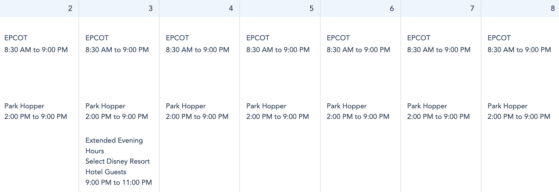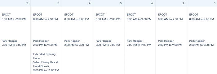 EPCOT’s hours will be the same every day next week, opening from 8:30AM to 9PM.