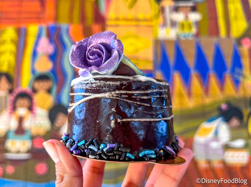 This is the Madame Leota Dark Chocolate Cake from Contempo Cafe at Disney’s Contemporary Resort. It’s a devil’s food mini cake filled with dark chocolate ganache and topped with chocolate glaze and marshmallow webs for $6.29.