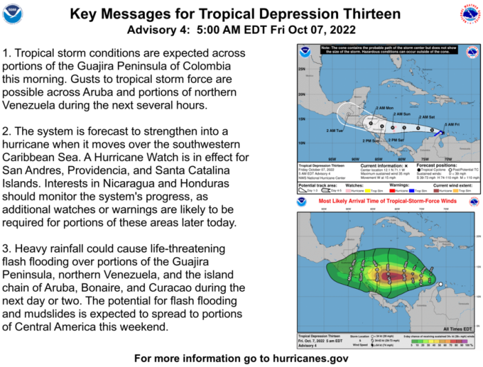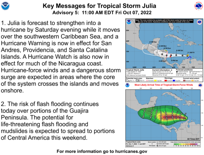 According to their updates, tropical storm conditions are expected across parts of Columbia and Venezuela. It is then expected to strengthen into a hurricane and hurricane watches are in effect for San Andres, Providencia, and Santa Catalina Islands. There is also a potential for flash flooding in parts of Central America.