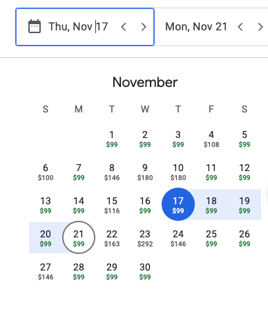 In terms of dates, we only search for flights that leave on Thursday and arrive on Monday in a particular week. For November 2022, we looked at a trip that departed on Thursday, November 17th and returned on Monday, November 21st. November 11th is Veteran’s Day so we avoided that weekend as it could be busier and more expensive. We also avoided later days in November since Thanksgiving falls on November 24th.