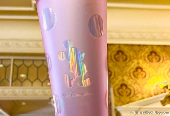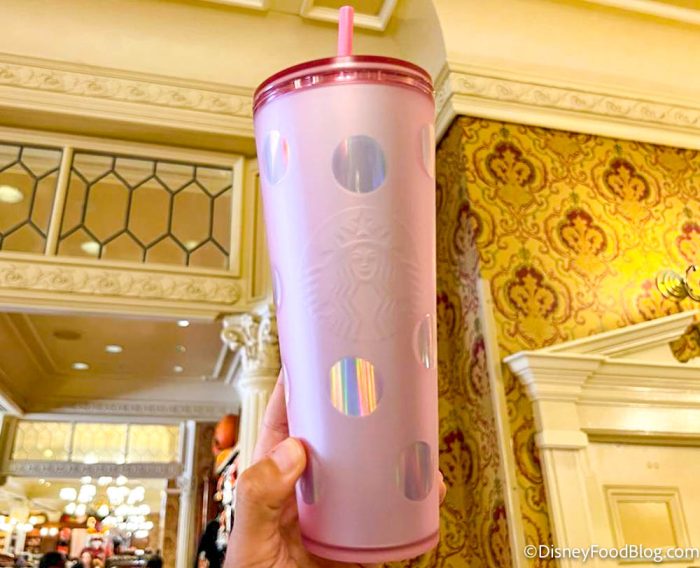 While we were in Magic Kingdom today, we spotted a pink Starbucks cup with shiny polka dots all over. The cup has the Starbucks logo on one side…