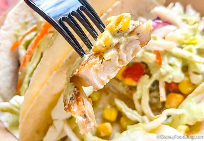 All other tacos in Disney World need to watch out, because these were delicious! The fish was perfectly flaky with a little bit of crispiness on the outside. It wasn’t dry at all — there was so much sauce on each taco that it was practically impossible for them to taste too dry.