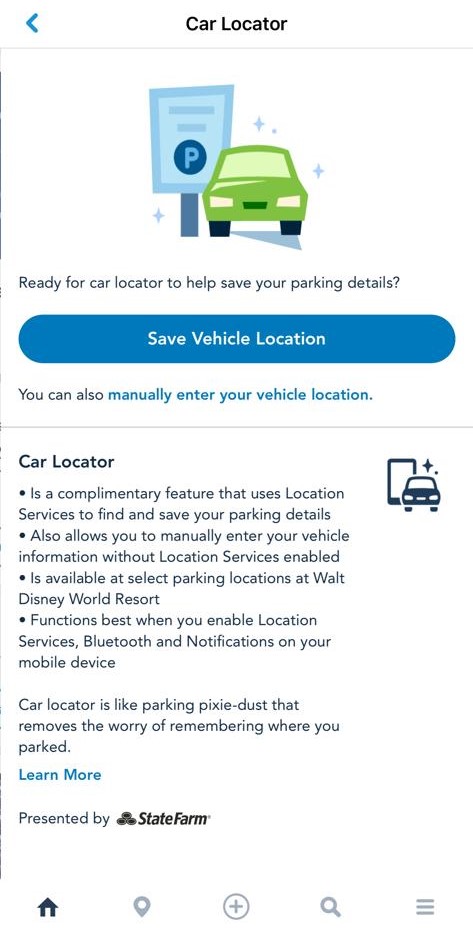 This is a complementary feature on the app presented by State Farm. It uses Location Services to find and save your parking information at the Mickey & Friends and Pixar Pals parking structures, as well as the Toy Story and Simba parking areas.