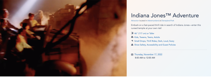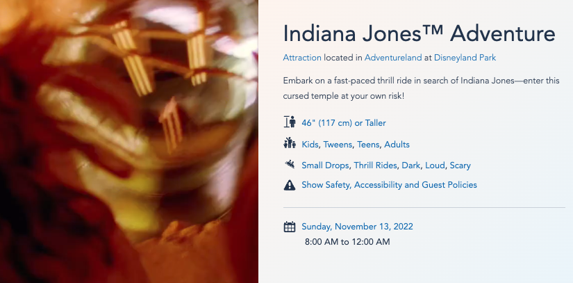 We took a look at the attraction’s page on the Disneyland website to dig a little deeper, and it looks like the attraction will still be available through Sunday, November 13th, but when you look at the following day…