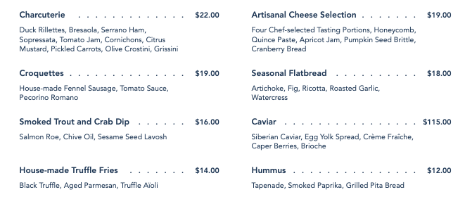 If you’re feeling fancy (as in, “$115 for a snack” fancy), there will be a Caviar dish, which includes Siberian caviar, an egg yolk spread, crème fraiche, caper berries, and brioche. This isn’t the first time we’ve seen caviar on the menu at this lounge, although this particular dish is new. And yes, it really costs $115.