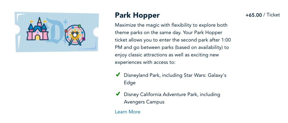 So far, it looks like ticket prices have increased by an average of about 8-9% across the board depending on the date of your planned visit — though the base ticket price still appears to be $104. Previously, Disneyland 1-day tickets started at $104, and if you want a Park Hopper ticket, you were looking at an additional $60 per ticket. Now, the Park Hopper add-on will cost $65 per ticket for one day.
