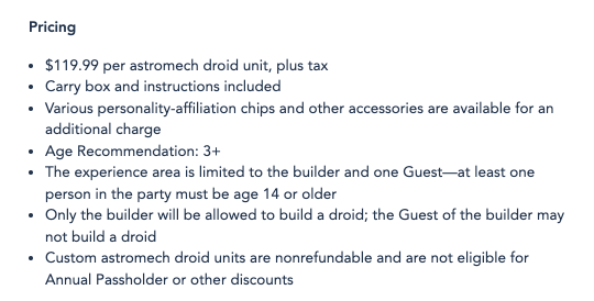 Previously, the build-your-own droid experience at Droid Depot cost $99.99, plus tax. Now, however, the Disney World website notes that the price is $119.99, plus tax.