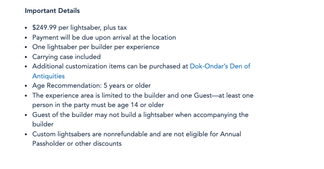 The Disney World website now notes that the price for this build-your-own lightsaber experience is $249.99. This still includes the lightsaber and carrying case.
