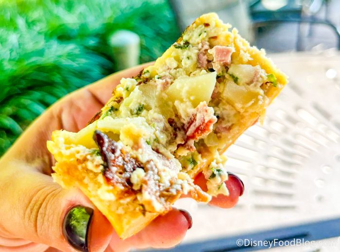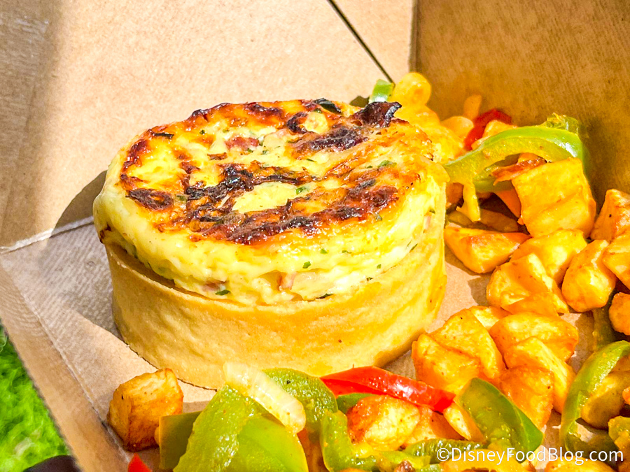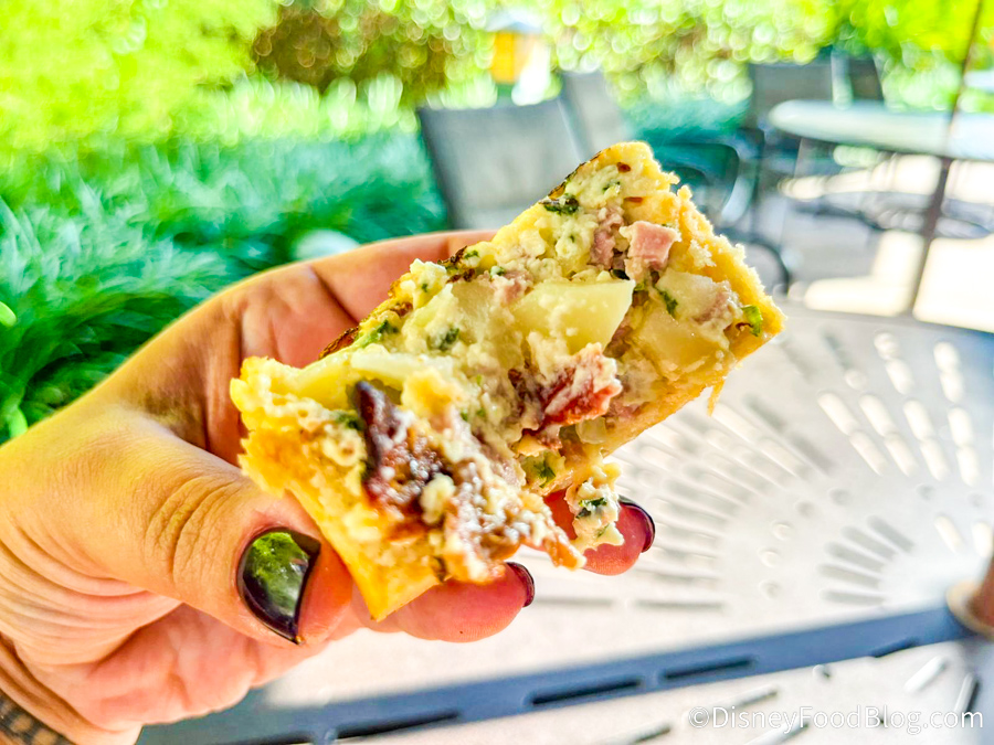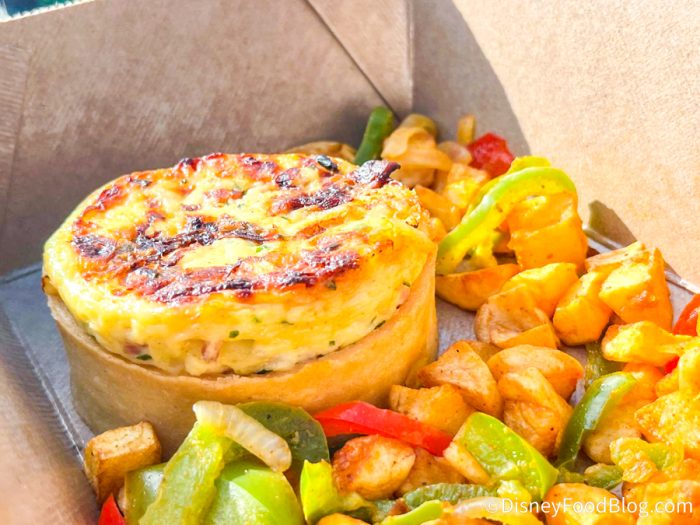 Roaring Fork, which is a quick service dining location over at Wilderness Lodge, has some new food items for breakfast, lunch, and dinner. We’ve already tried out some of the offerings available later in the day, so let’s talk about breakfast! The new items over here are the Meat and Potatoes Quiche, the Vegetable Lover’s Quiche, the Warm Freshly Baked Cinnamon Roll, and the Warm Grizzly Bear Claw.