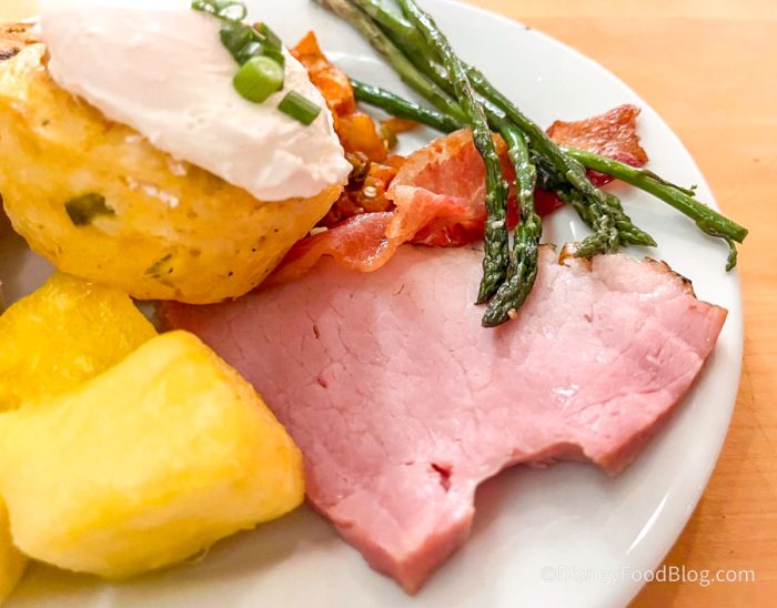 As far as meats go, we tried both the ham and the bacon. The bacon was your typical Disney bacon, not too salty and on the chewier side rather than having any sort of crunch or crispness. We definitely didn’t hate it!