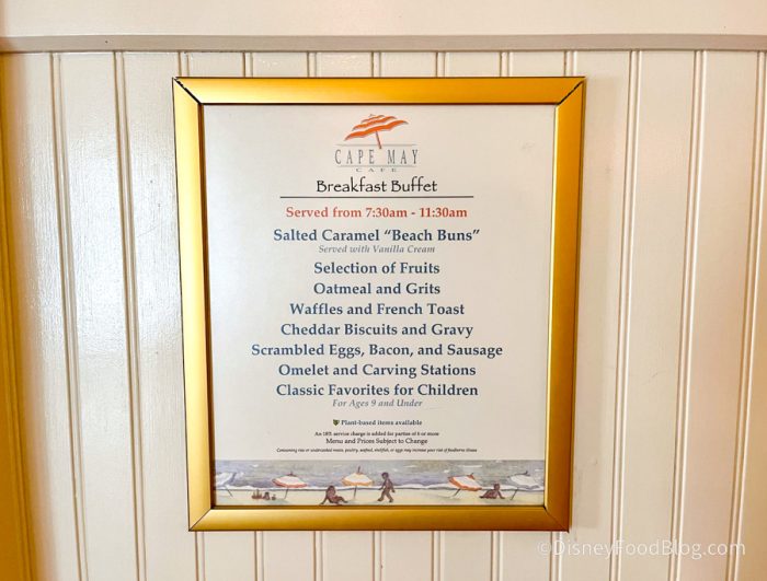 Cape May Cafe serves an all-you-care-to-enjoy buffet menu full of delicious breakfast favorites! Since characters are back, the price has gone up and is now $45 per adult and $29 per child.