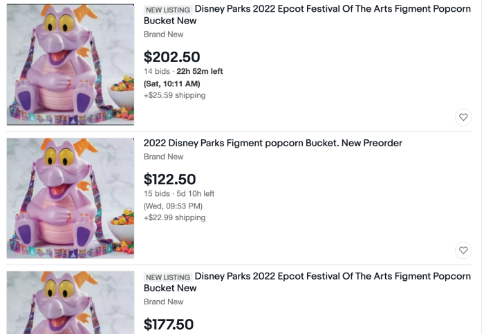 We saw this happen especially with those infamous Figment popcorn buckets at EPCOT’s Festival of the Arts this past winter. Even though Disney sets merchandise limits, these people somehow were walking around with full bags stuffed with popcorn buckets, and they were going for HUNDREDS of dollars online before it was even the afternoon. This is not allowed at Disney World, and you CAN get in trouble for it, especially if you’re an Annual Passholder. It just ruins it for other people — you’re taking merchandise away from people who paid to be in the parks and just want a souvenir. Sharing is caring!
