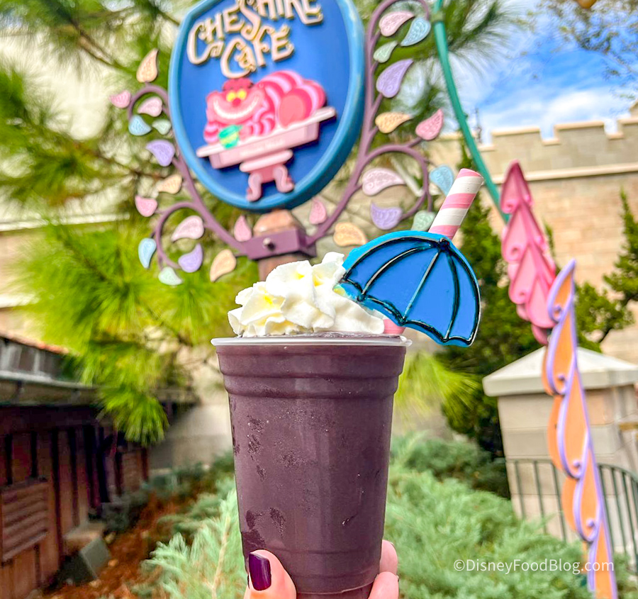 We’re heading over to Cheshire Cafe in Magic Kingdom to try the newest slush on their menu. The Twinkle Twinkle Little Bat slush is a frozen grape drink topped with whipped cream and a chocolate umbrella for $5.99.