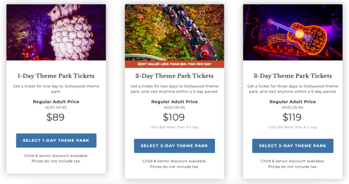 Tickets for Dollywood cost $89 for a 1-day ticket and $109 for a 2-day ticket. That means you can visit for 2 days for the same cost as 1 day in Disney World. A 3-day ticket is only $119.