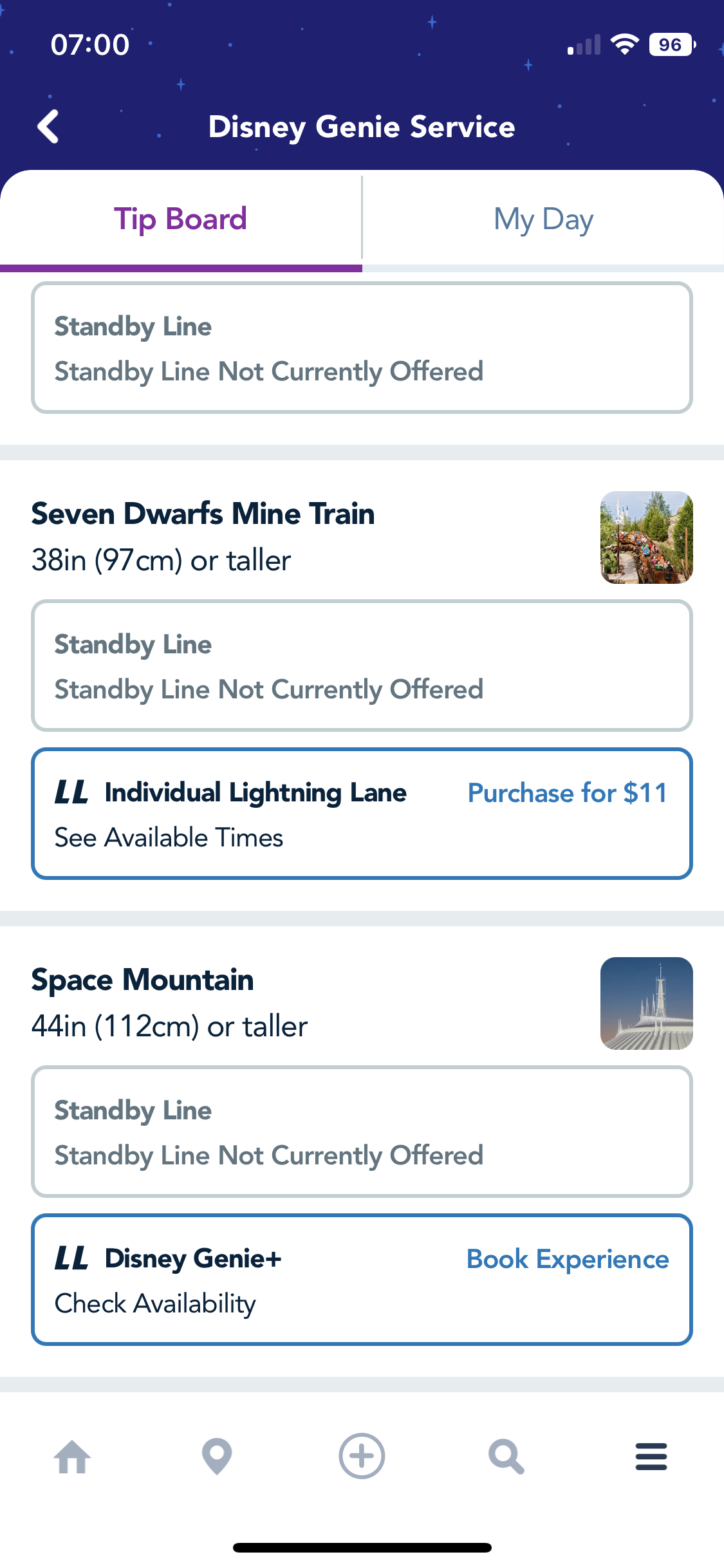 We also looked at the Individual Lightning Lane attraction costs. Seven Dwarfs Mine Train is $11.