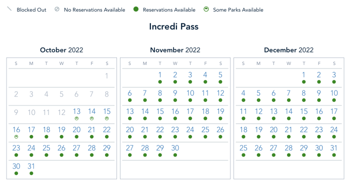 If you’re a Disney World Annual Passholder you have a different calendar of park pass availability. Next week, the Incredi Pass has no blockout dates with full park availability except for on October 16th, when only some parks are available.