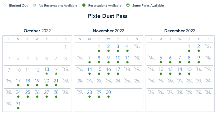 And, the Pixie Dust Pass is blocked on October 16th & 22nd, but the rest of the week is open for reservations.