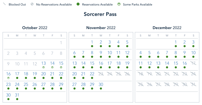 If you have the Pirate Pass you also have no blockout dates and every day is fully available except for October 16th.