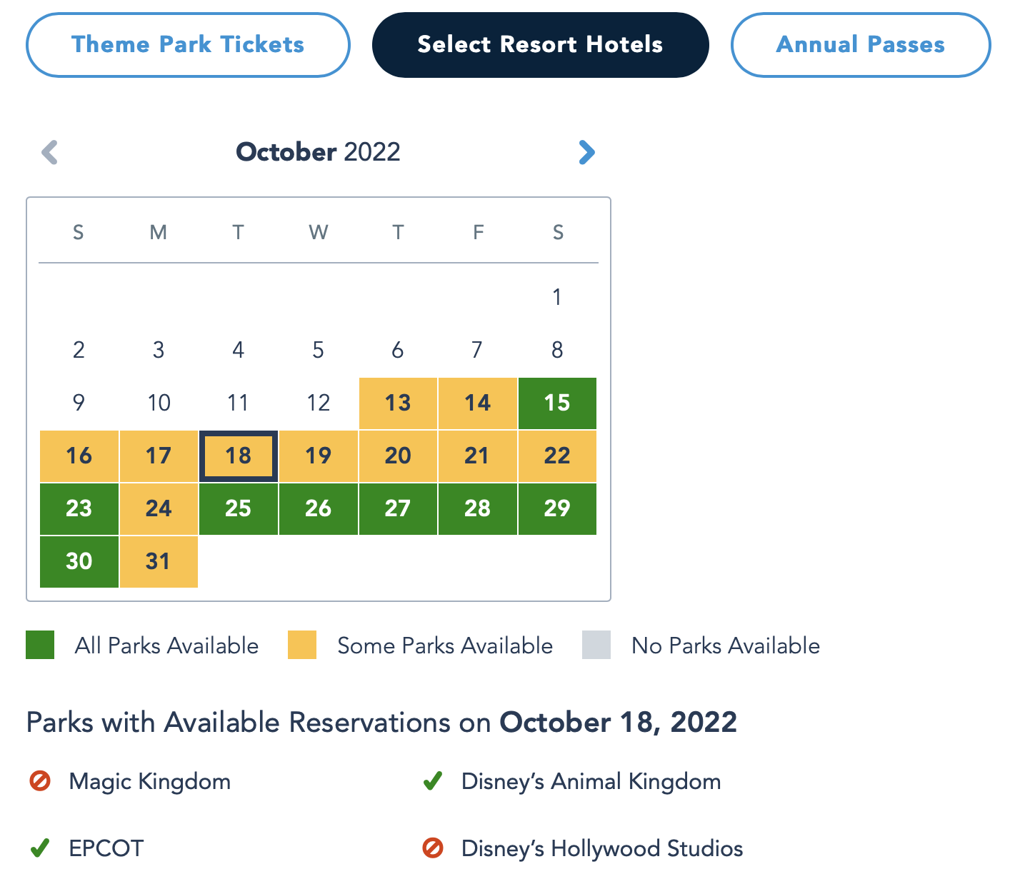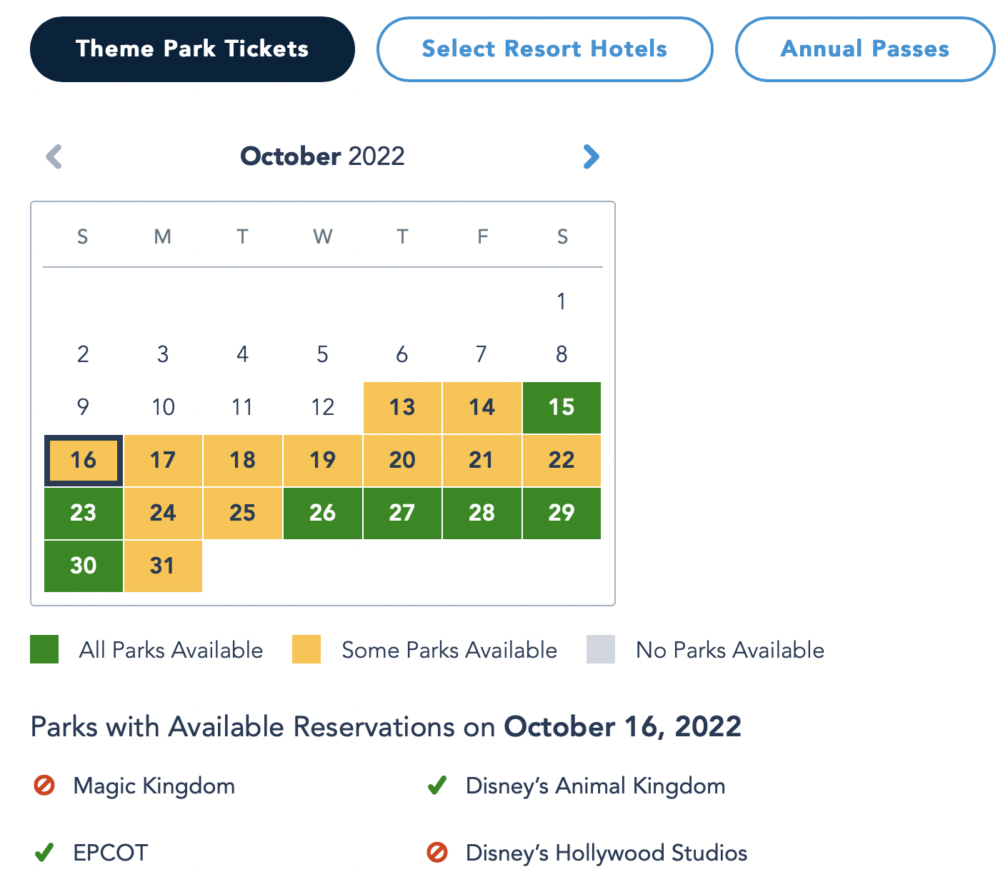The Disney World Park Pass availability calendar is divided by theme park tickets, resort hotels, and Annual Passes. For visitors with Theme Park Tickets, both Magic Kingdom and Hollywood Studios are booked up for October 16th-21st. Then, only Magic Kingdom is full for October 22nd.