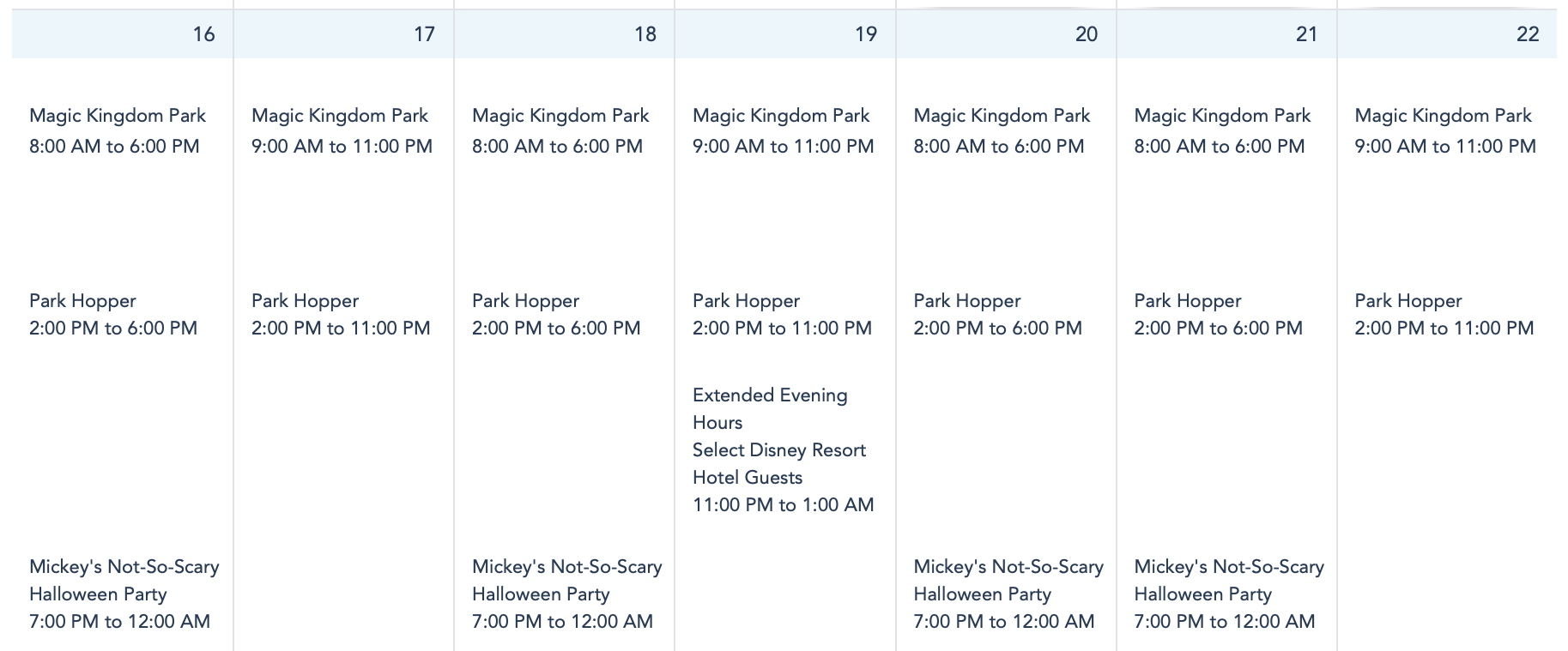 We’re starting in Magic Kingdom, where on October 17th, 19th, and 22nd the park will be open from 9AM to 11PM. On October 16th, 18th, 20th, and 21st, Magic Kingdom will be open from 8AM to 6PM due to Mickey’s Not-So-Scary Halloween Party, which runs from 7PM to 12AM on those dates.