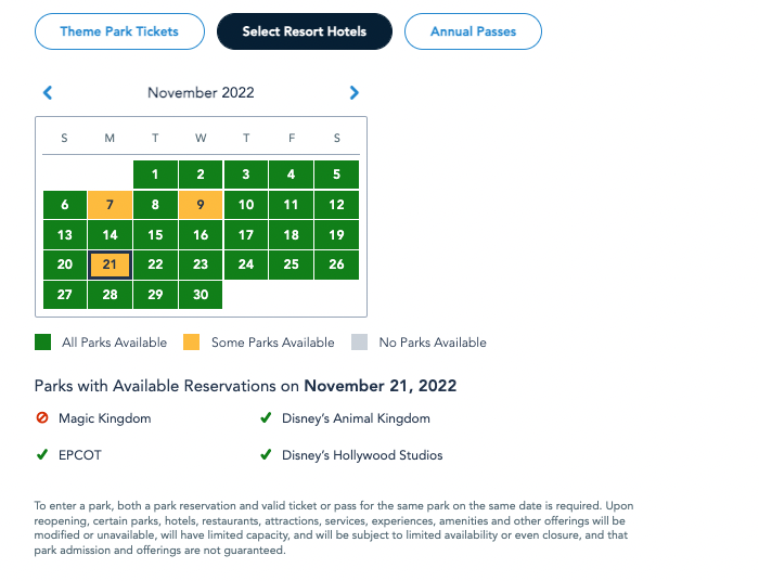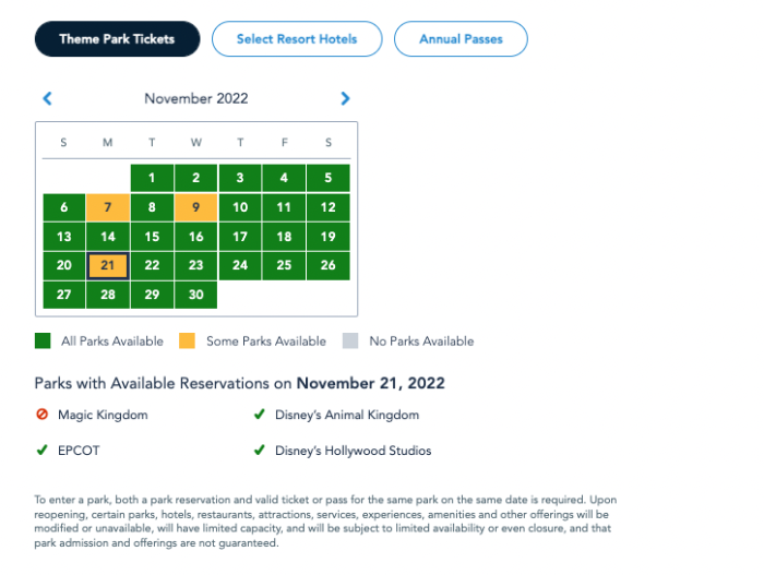 We recently took a look at Disney World’s Park Reservation availability calendar and as you can see, there are already dates with sold-out parks in November. Remember, you still need a Park Pass to enter a Disney Park, even with valid admission, and for ticket holders, Magic Kingdom is sold out on November 7th, 9th, and 21st.