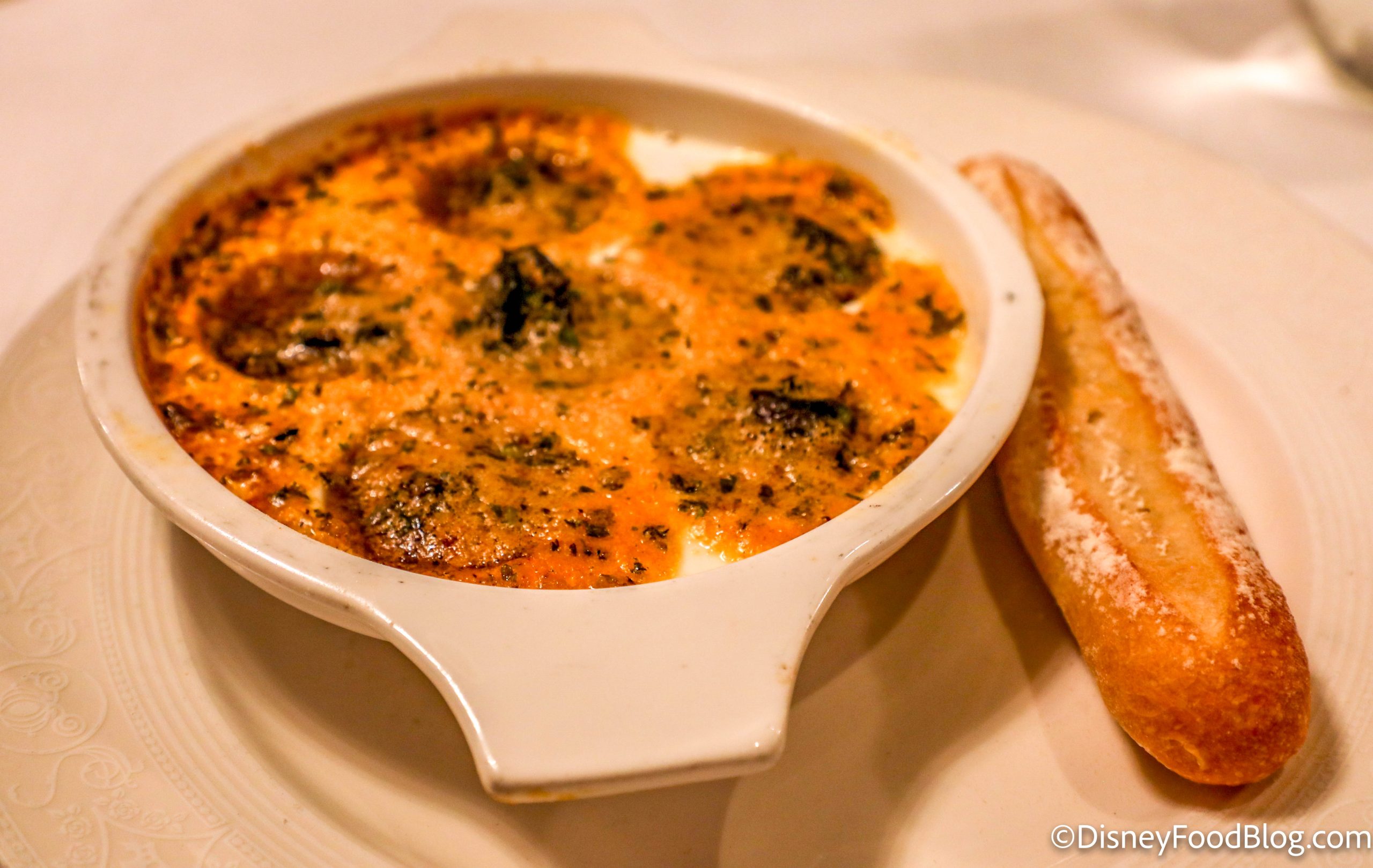 We also ordered Gaston’s Escargot Gratinee, which came with herb-marinated snails with finely chopped mushrooms, topped with garlic butter. This was one of our favorite dishes of the entire Disney Dream sailing! It was SUPER buttery and garlicky and the snails were cooked perfectly — no weird textures here. If you’re a fan of mussels, you need to try this.