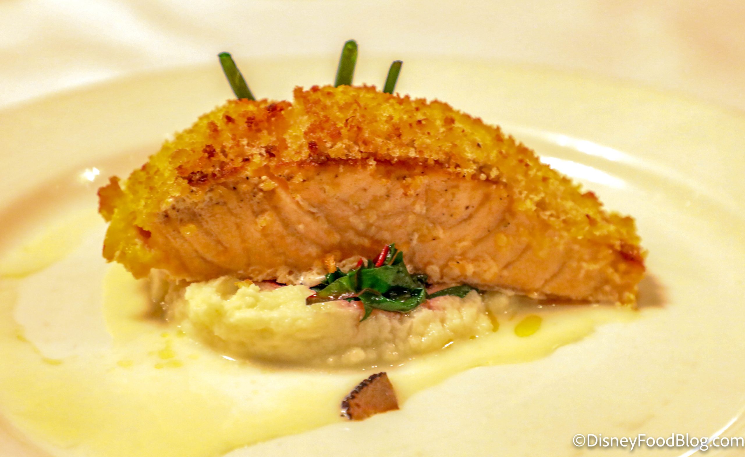 The Oven-Baked Salmon Royale was made with King Smoked Salmon, horseradish crust, sauteed swiss chard, truffled cauliflower puree, and white wine beurre blanc. This was our least favorite of the fish dishes we tried on the Disney Dream. The horseradish crust was not very flavorful, and even though the salmon was cooked well and fell apart on our fork, it wasn’t anything special. It was basically something we could probably make on our own at home.