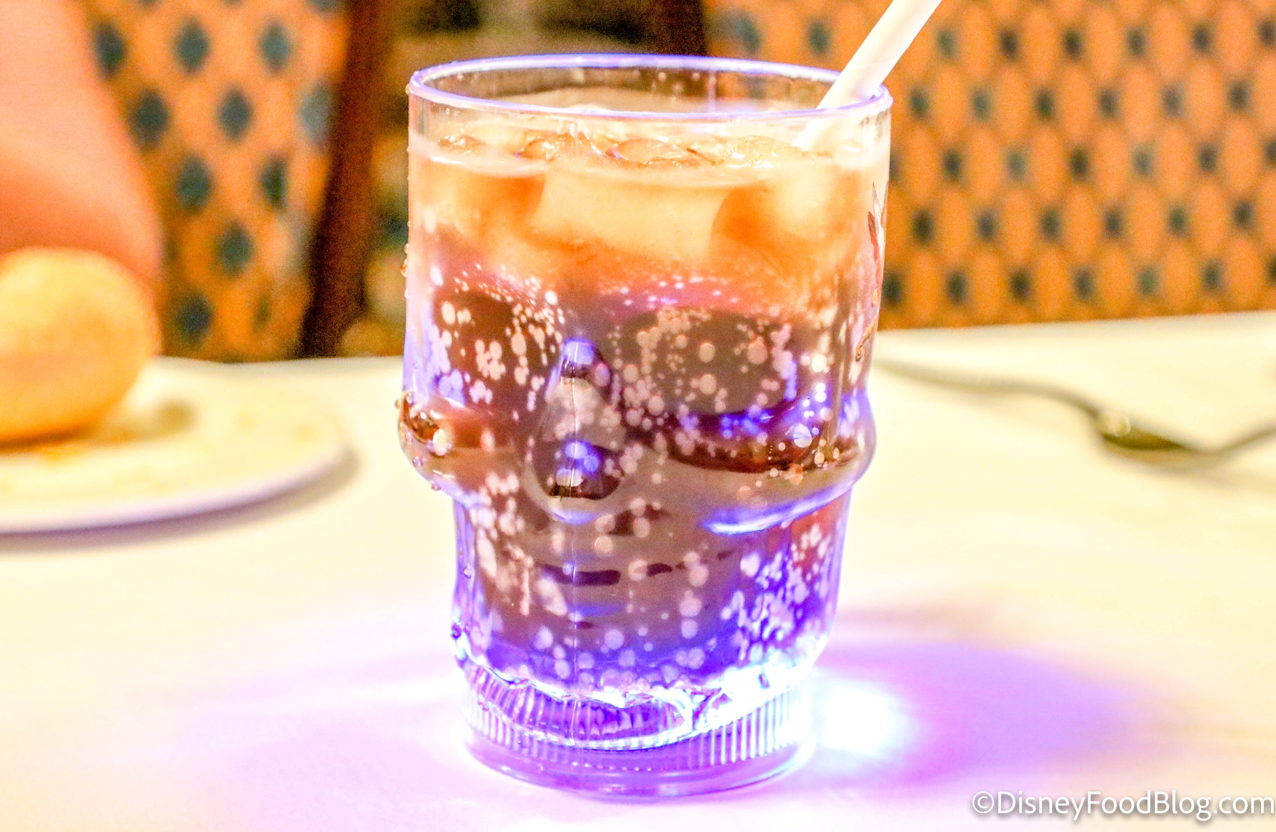 We started our meal with some soda, which was delivered in a light-up Souvenir Skull Cup. (The reason for this off-theme item was that we ate dinner at the Royal Palace on Pirate Night!)