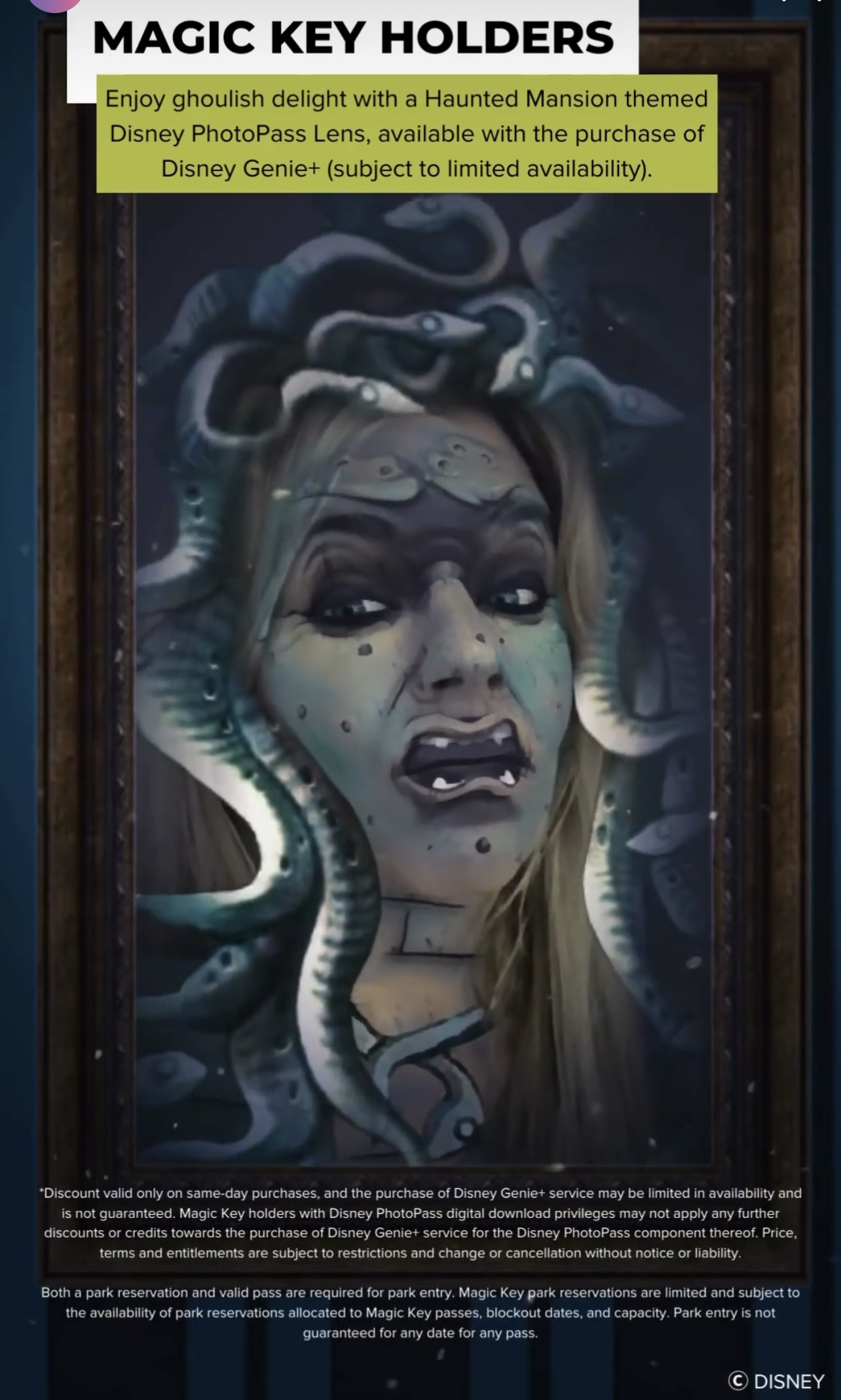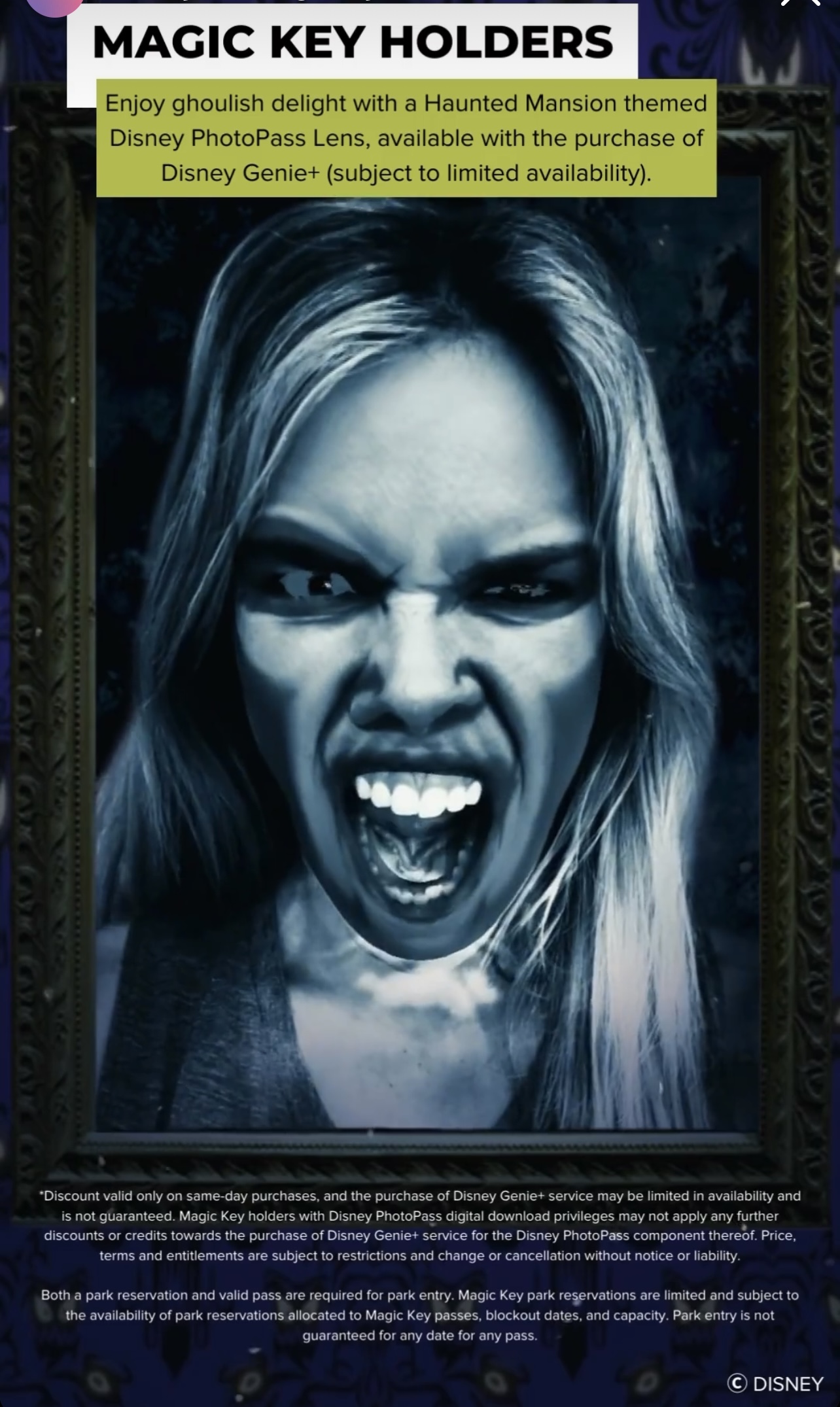 Magic Key Holders (those who have an annual pass to Disneyland) can try out 3 Haunted Mansion PhotoPass lenses when they buy Disney Genie+ for the day of their trip! PhotoPass lenses work like Snapchat filters, where you can use your phone to take a picture, which is modified in some way. Purchasing Genie+ always opens up access to a few lenses, but now there are some NEW ones for spooky season! The first 2 lenses remind us of the wall of photos that you see on the Haunted Mansion ride. The first will turn you into a frightening screaming woman.